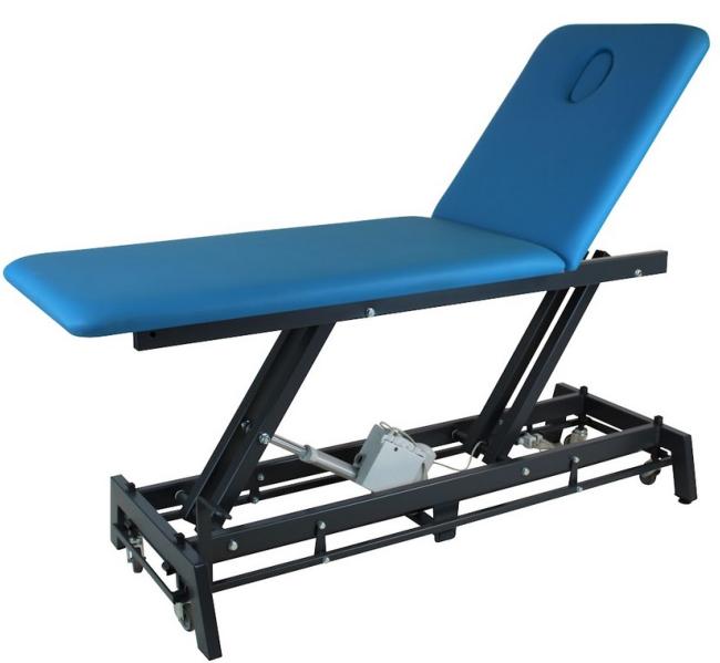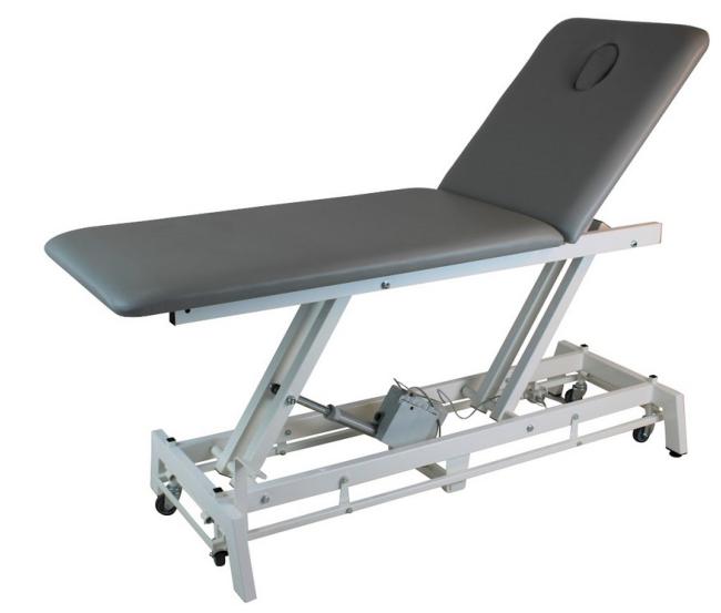 Table KINE 2 parties dos avec trou visage triangulaire, réglage électrique de la hauteur, roulettes et cadre de commande.